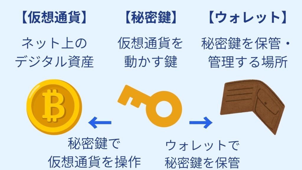 実際には仮想通貨そのものを入れるのではなく、「秘密鍵(ひみつかぎ)」と呼ばれる資産の所有権を証明する鍵を管理する仕組みです。