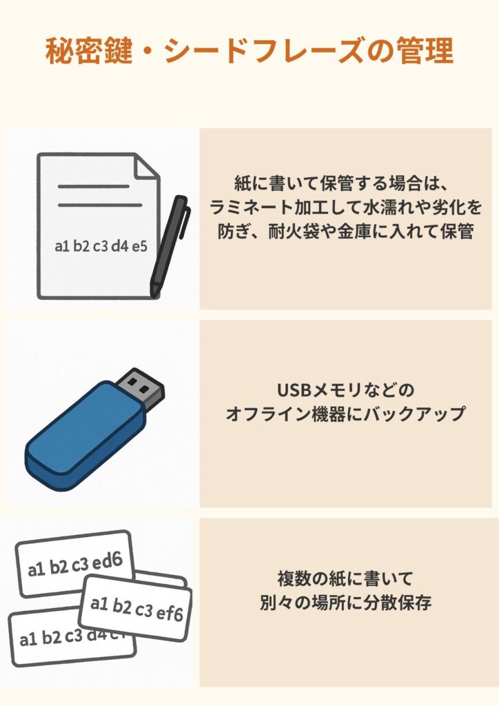 ウォレットを使ううえで最も大切なのが、秘密鍵とシードフレーズの管理です。