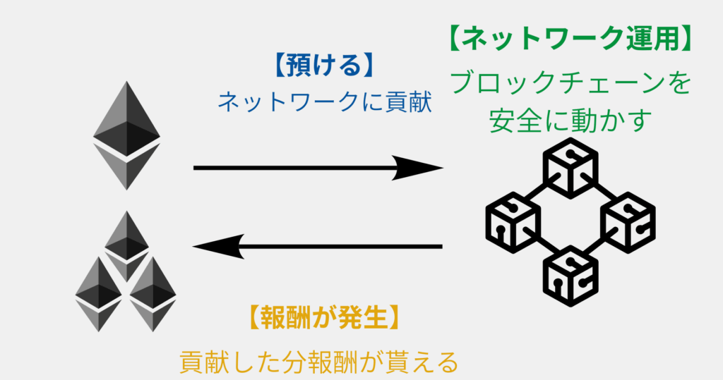 ステーキングとは、仮想通貨を一定期間預けることで報酬(利息のようなもの)をもらえる仕組みです。